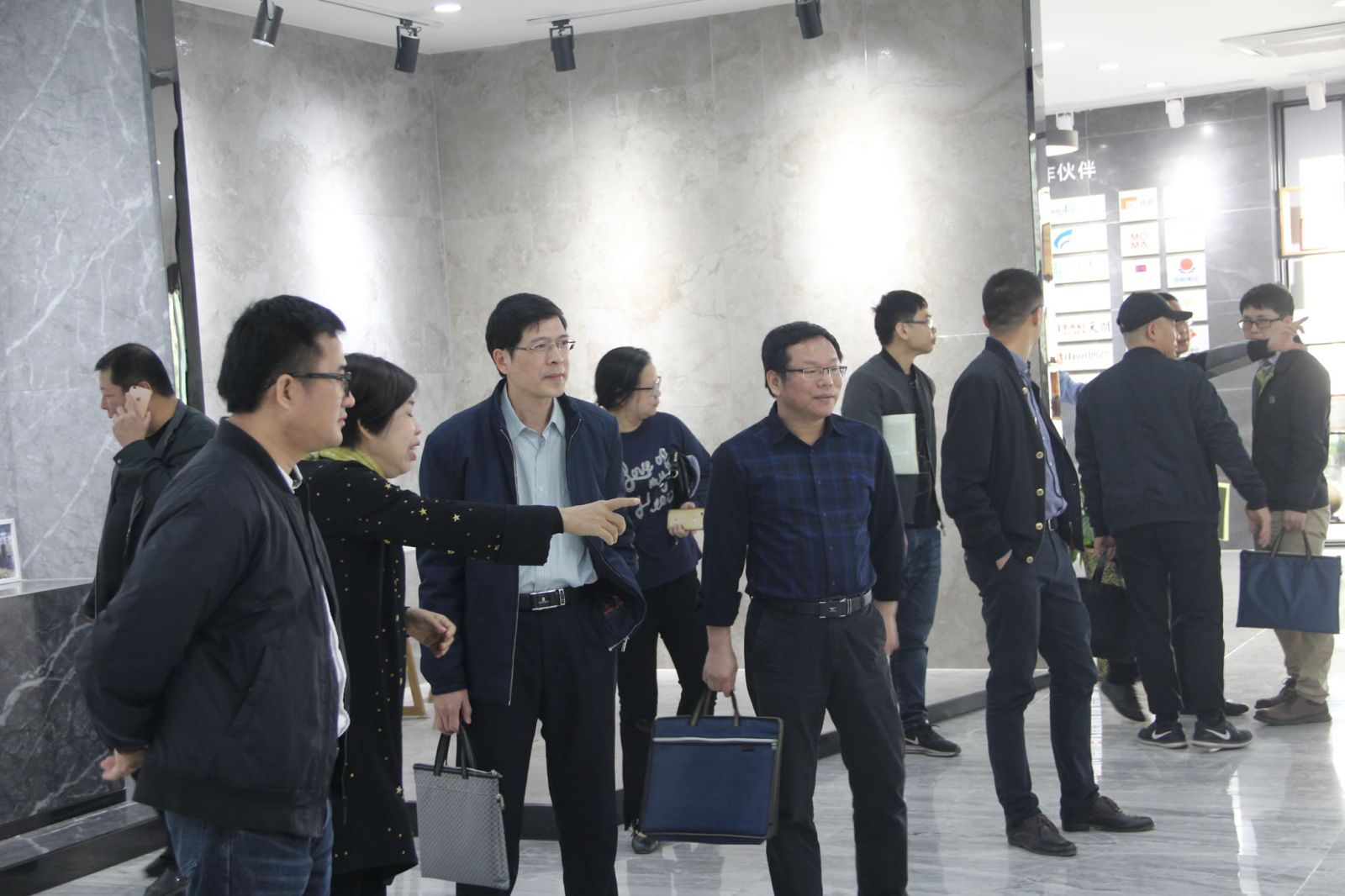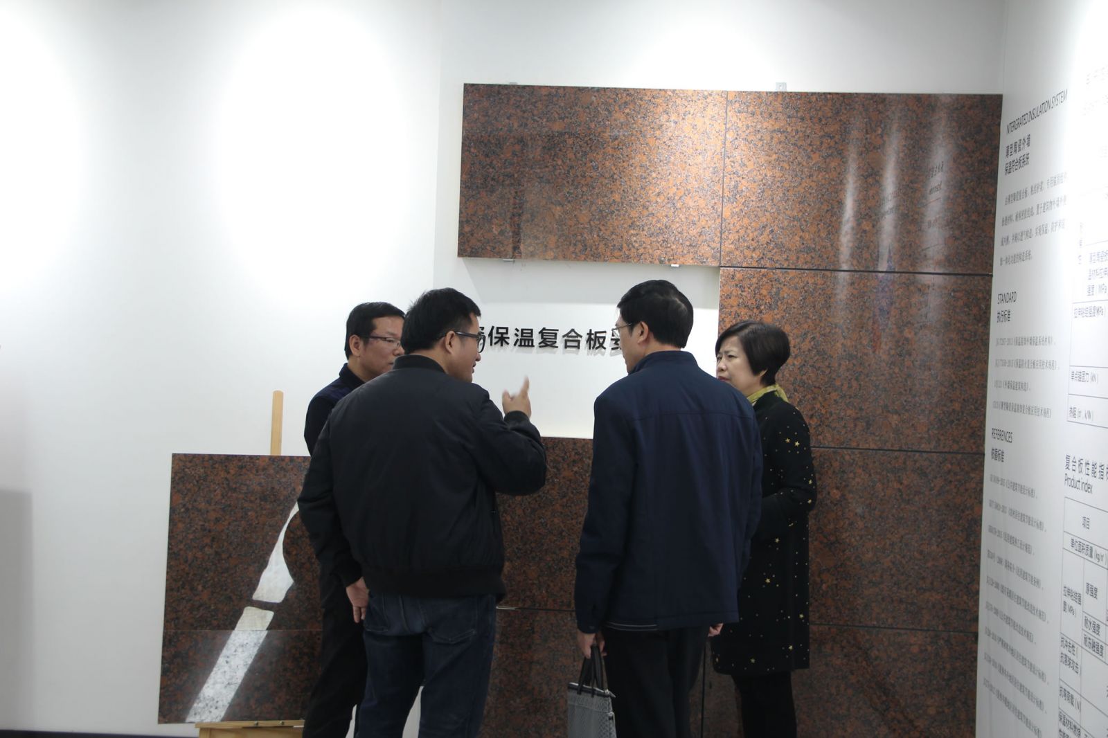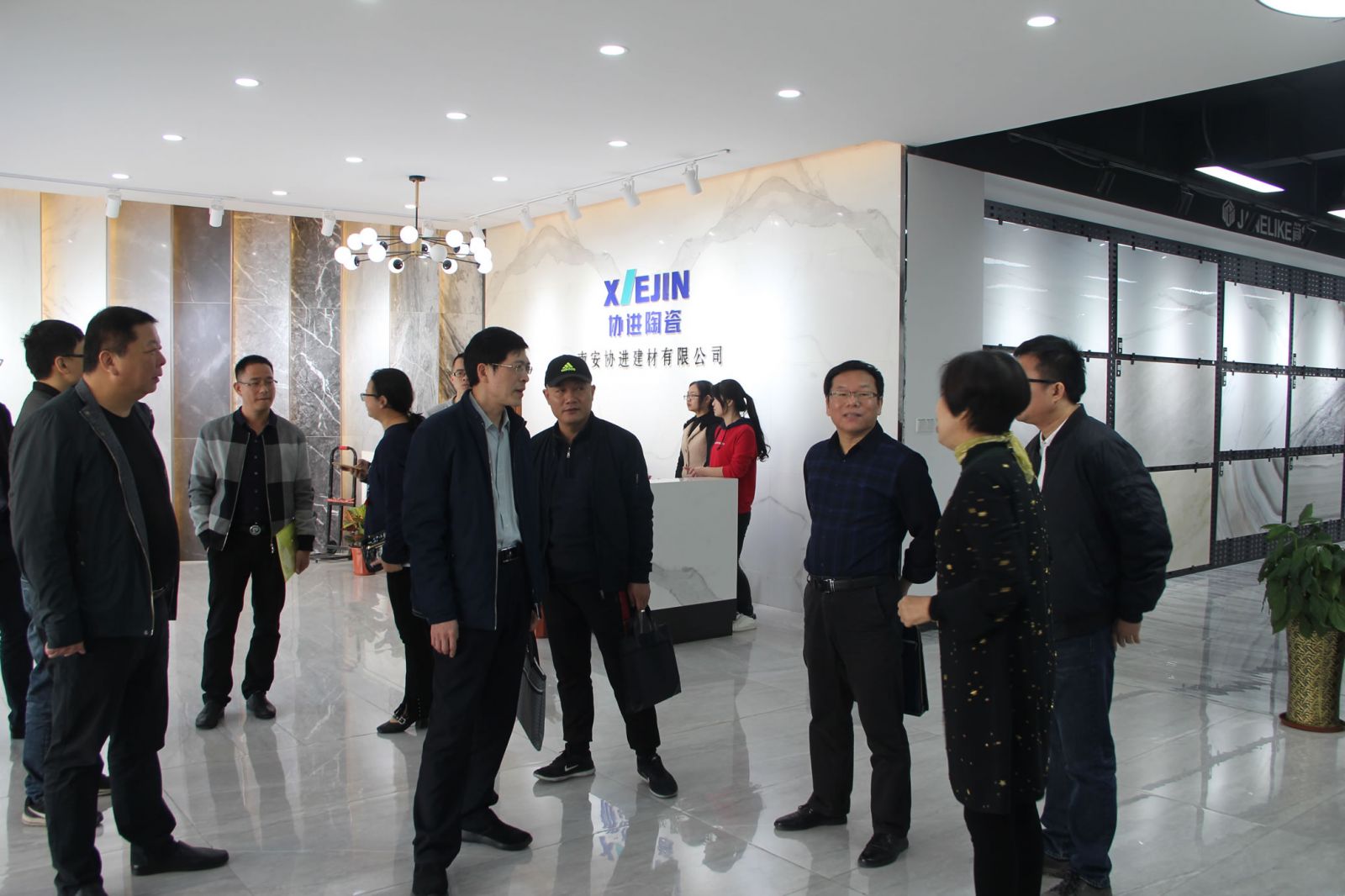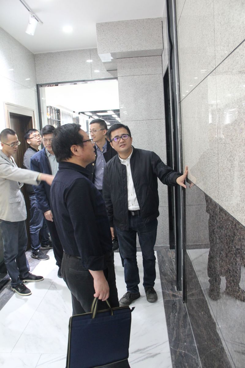馮副處長一行在楊寶貴副董事長、王少華總經理的陪同下參觀了產品展廳,對協進研發生產的一系列大規格薄板、大板、陶瓷薄板復合保溫一體板等綠色節能新產品稱贊有加,對協進公司近年來由小規格的外墻瓷磚產品轉型升級為內外墻多品類建筑裝飾材料的創新發展給予肯定。