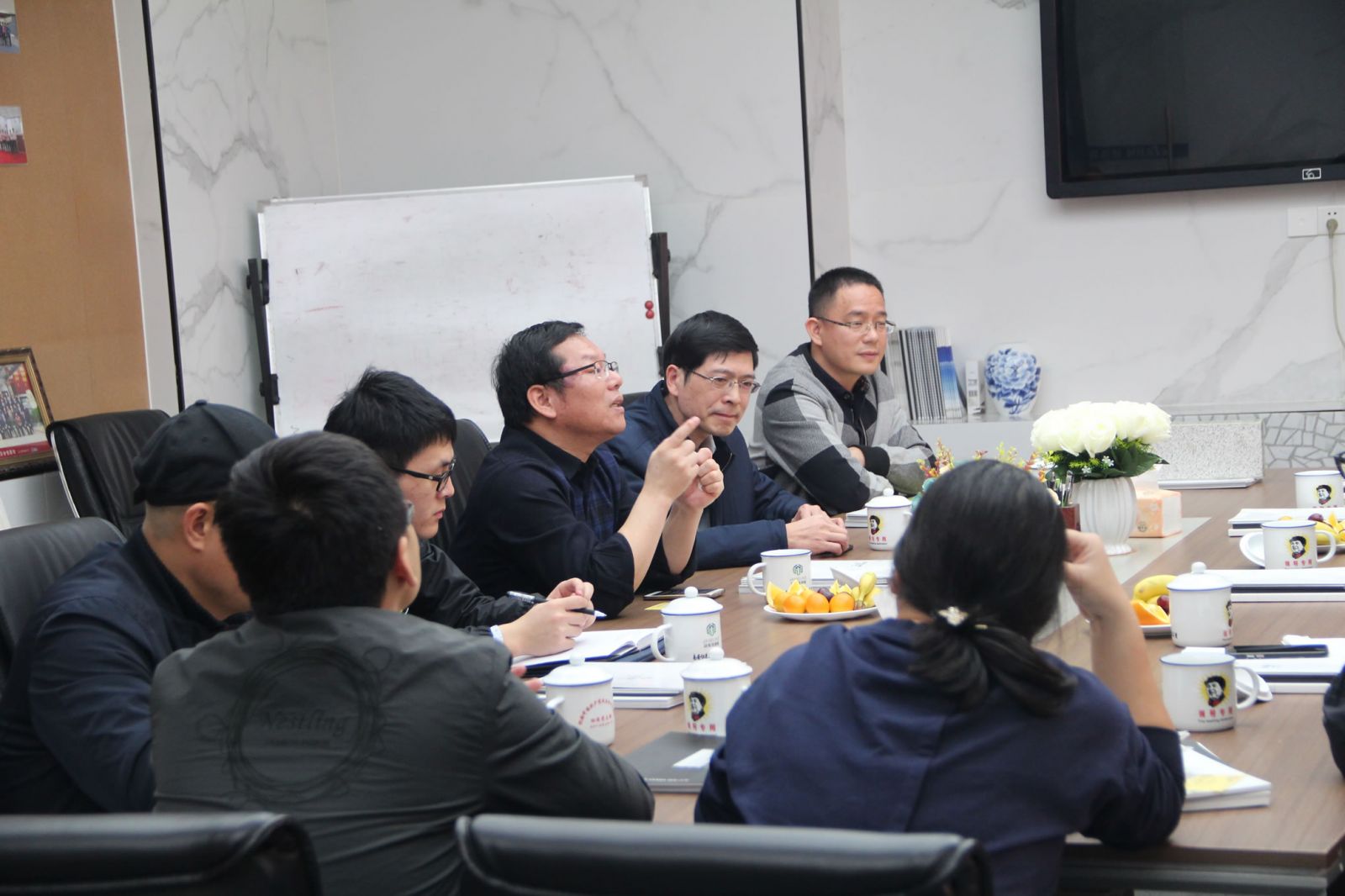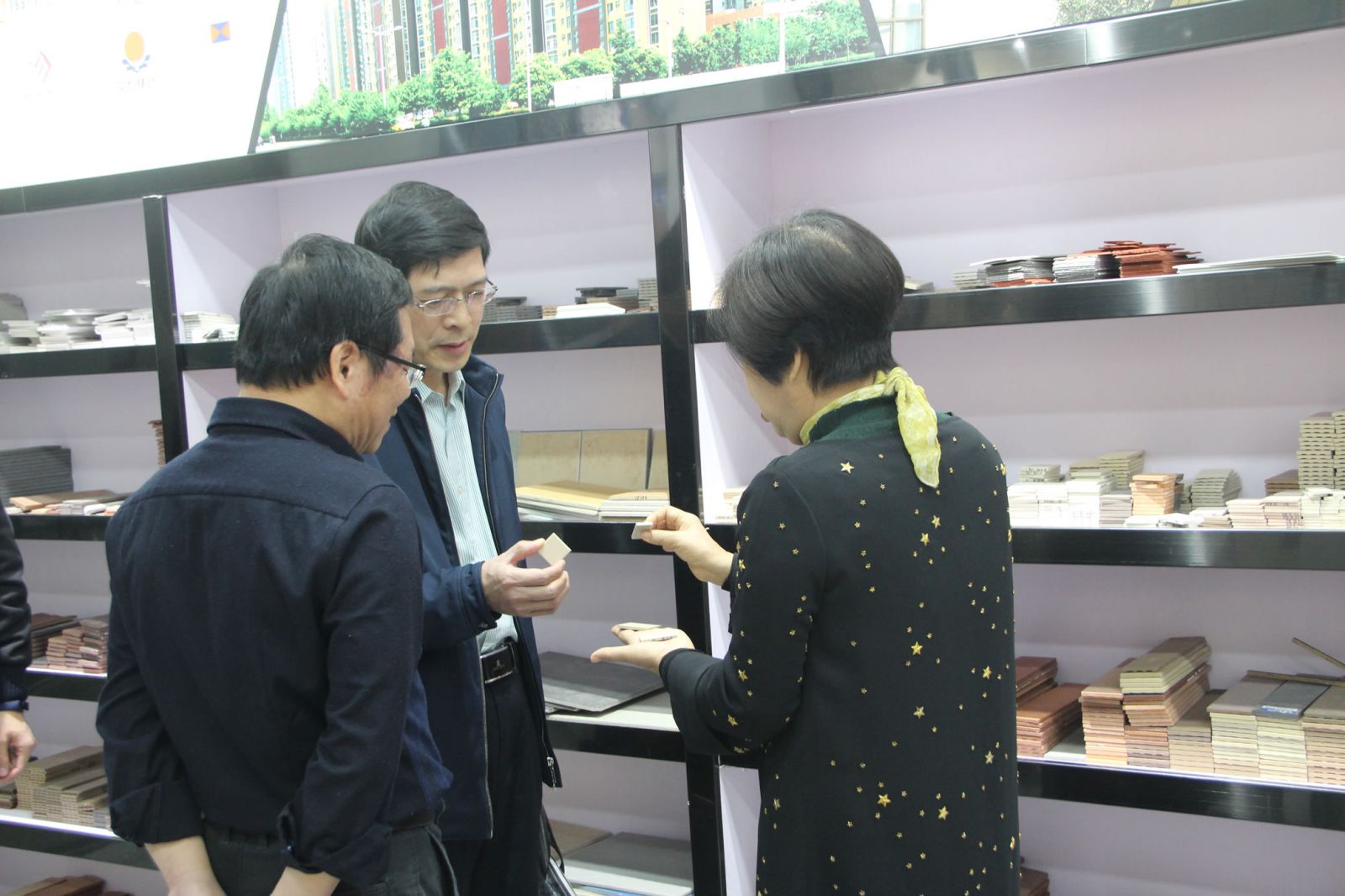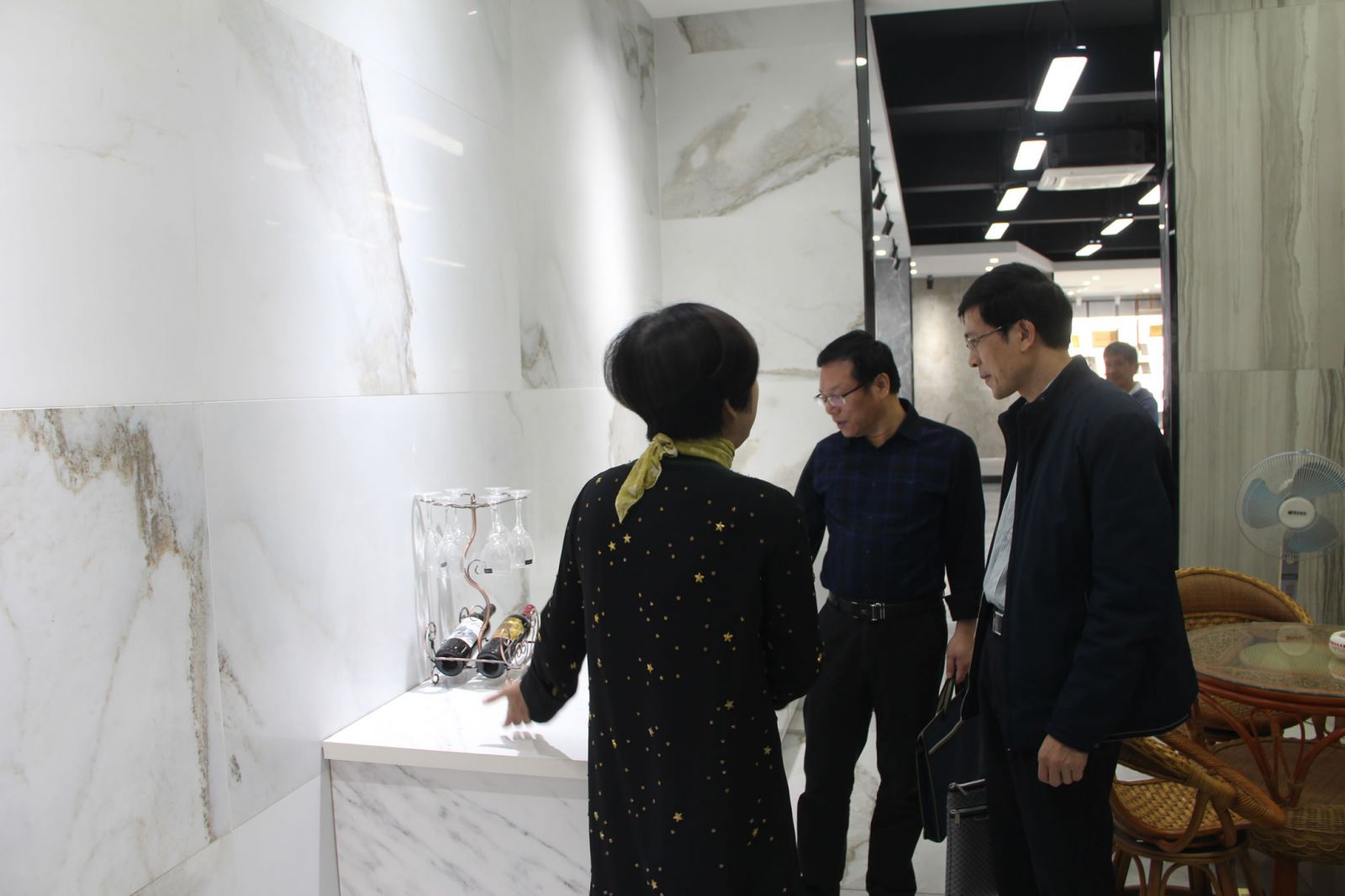 馮副處長一行在楊寶貴副董事長、王少華總經理的陪同下參觀了產品展廳,對協進研發生產的一系列大規格薄板、大板、陶瓷薄板復合保溫一體板等綠色節能新產品稱贊有加,對協進公司近年來由小規格的外墻瓷磚產品轉型升級為內外墻多品類建筑裝飾材料的創新發展給予肯定。